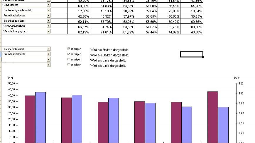 Umfangreiches Excel- Tool zur Berechnung der wichtigsten branchenunabhängigen Kennzahlen aus Bilanz und GuV. Neben den Kennzahlen, die mit Erläuterungen versehen sind, werden die G+V und Bilanz in 5 Jahres-Überischt dargestellt und automatisch eine Kapitalflussrechnung erstellt. Zusätzlich werden druckbare Berichte generiert, die die Liquiditäts-, Vermögens- und Ertragslage des Unternehmens im 5 Jahresvergleich darstellen. Für jede Kennzahl kann entweder ein Balken- oder ein Liniendiagramm angezeigt werden.In den Diagrammen können verschiedene Kennzahlen im Jahresverlauf dargestellt werden und miteinander verglichen werden.